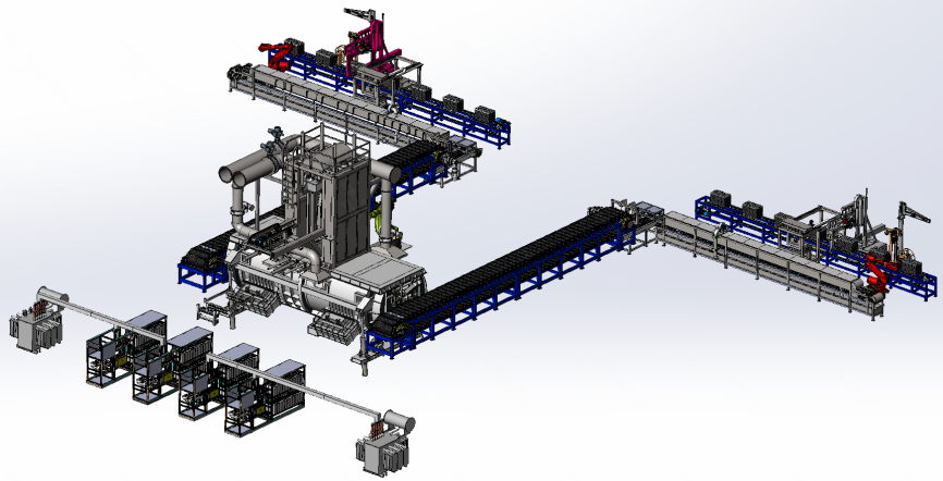 矿冶集团北矿机电开发的锌锭高效智能化成套装备应用于有色金属(锌)冶炼领域的关键终端装备,可实现大规模、高效率、高品质、高自动化、低能耗、安全环保的锌锭连续生产。该成套装备突破了传统铸锭模式在规模、效率、自动化程度和劳动环境上的瓶颈。锌锭高效智能化成套装备主要技术特点如下:超大功率工频熔锌感应电炉:采用高效长寿命大功率感应体(3600kW、4000kW)配套整垛夹持式加料系统、机器人扒渣系统及智能控制系统,解决了传统设备能耗高、寿命短、依赖人工的痛点。自动扒渣/除渣:集成先进的视觉识别或传感器技术,在浇铸前或浇铸过程中自动精准去除锌液表面浮渣,大幅减少人工干预,提升锭面质量。智能浇铸控制:采用高精度流量控制阀、液位传感器和闭环控制系统,确保每个模具内锌液注入量精确、均匀,保证锌锭重量一致性(±0.5kg或更高精度)。在线质量检测:集成机器视觉系统,对锌锭外观(表面光洁度、飞边毛刺、裂纹等)、重量进行在线自动检测和分拣。机器人堆码与打包:配备高速工业机器人或专用治具,实现锌锭从脱模、冷却、输送、堆码(如码成2t大捆)到钢带/塑钢带自动捆扎的全过程无人化操作。中央控制系统:基于先进的PLC/DCS/AI人工智能系统,实现对整个机组运行状态、工艺参数、设备故障的集中监控、数据采集、分析和远程管理。